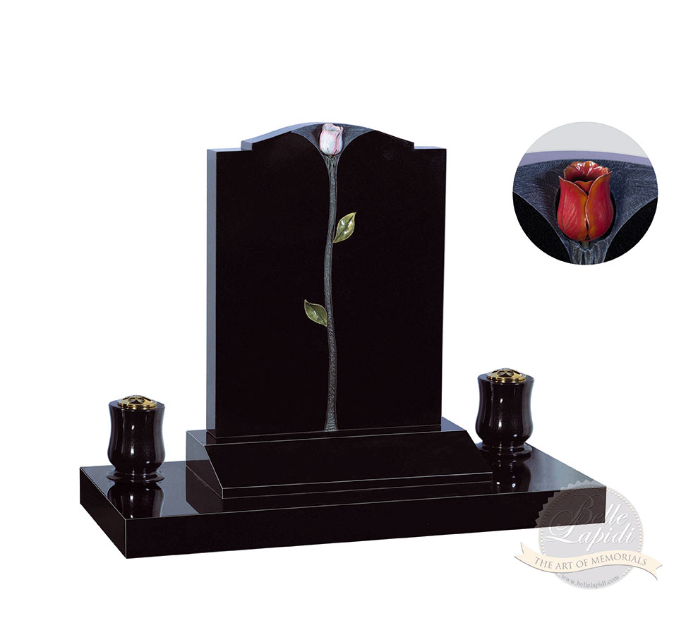 BL108 Jet Black Headstone Delightful bronze rose bud and leaves added to a classic shaped headstone. Finished with two granite vases sitting on foundation slab