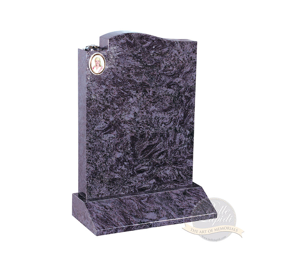 BL124 Silk Blue Headstone Spatkle effect and diamantes with a personalised photoplaque along with a flower container in the shaped memorial