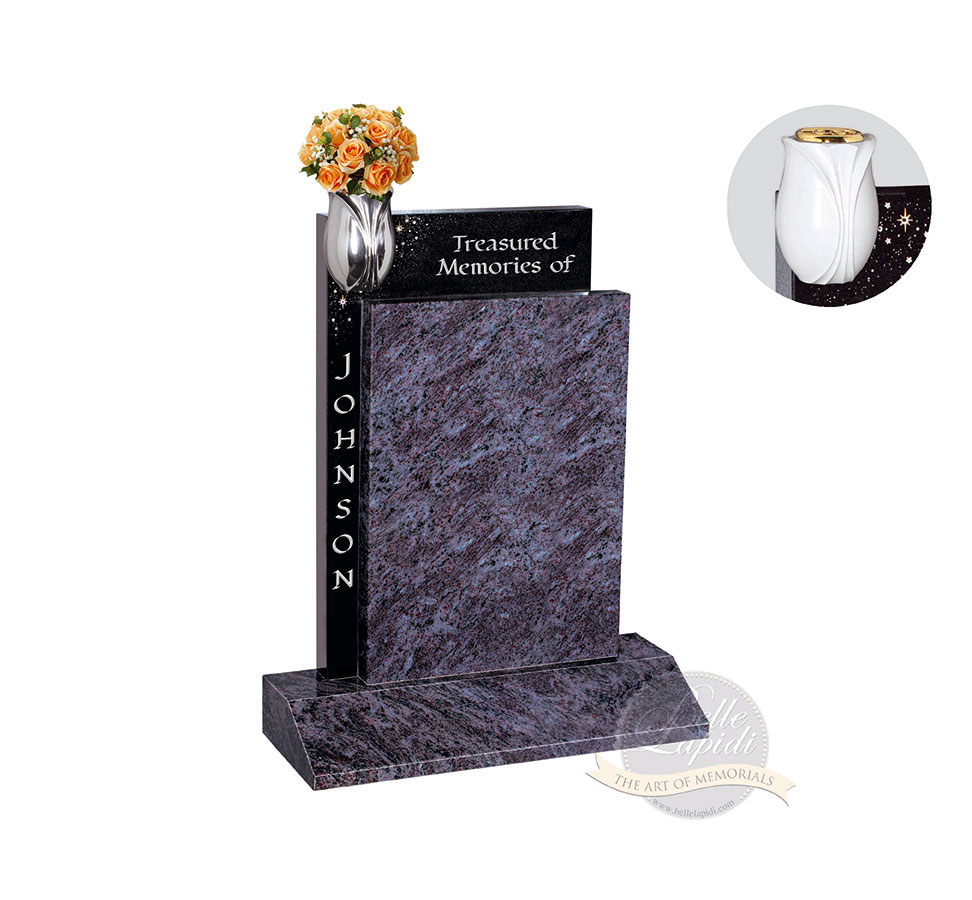 BL153 Silk Blue & Jet Black Headstone Two colours of granite make up this contemporary design. Finished with a flower container available in three colours