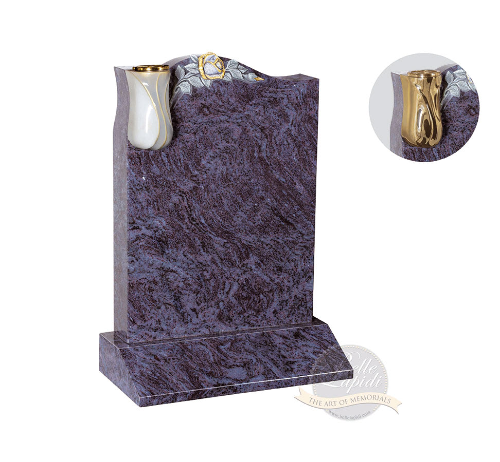 BL154 Silk Blue Headstone Intricately carved rose set on top of the curve of the headstone with a stunning vase which is also available in Gold