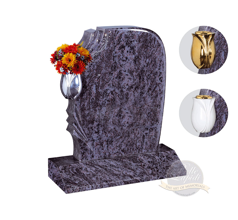 BL155 Silk Blue Headstone A beautiful shaped memorial with diamantes and sparkle effect with full splayed base. Finished with a gleaming flower container which is available in three colours