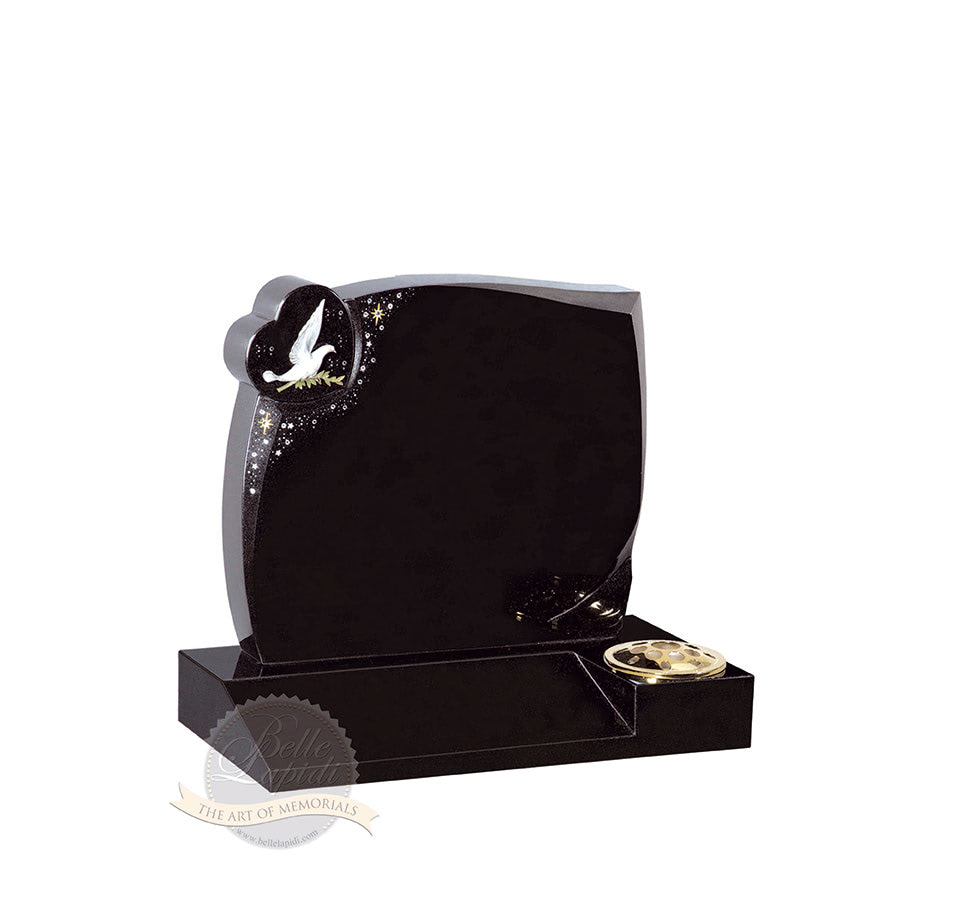 BL169 Jet Black Headstone Bronze flying dove with diamantes and sparkle etched effect on a bullnosed heart