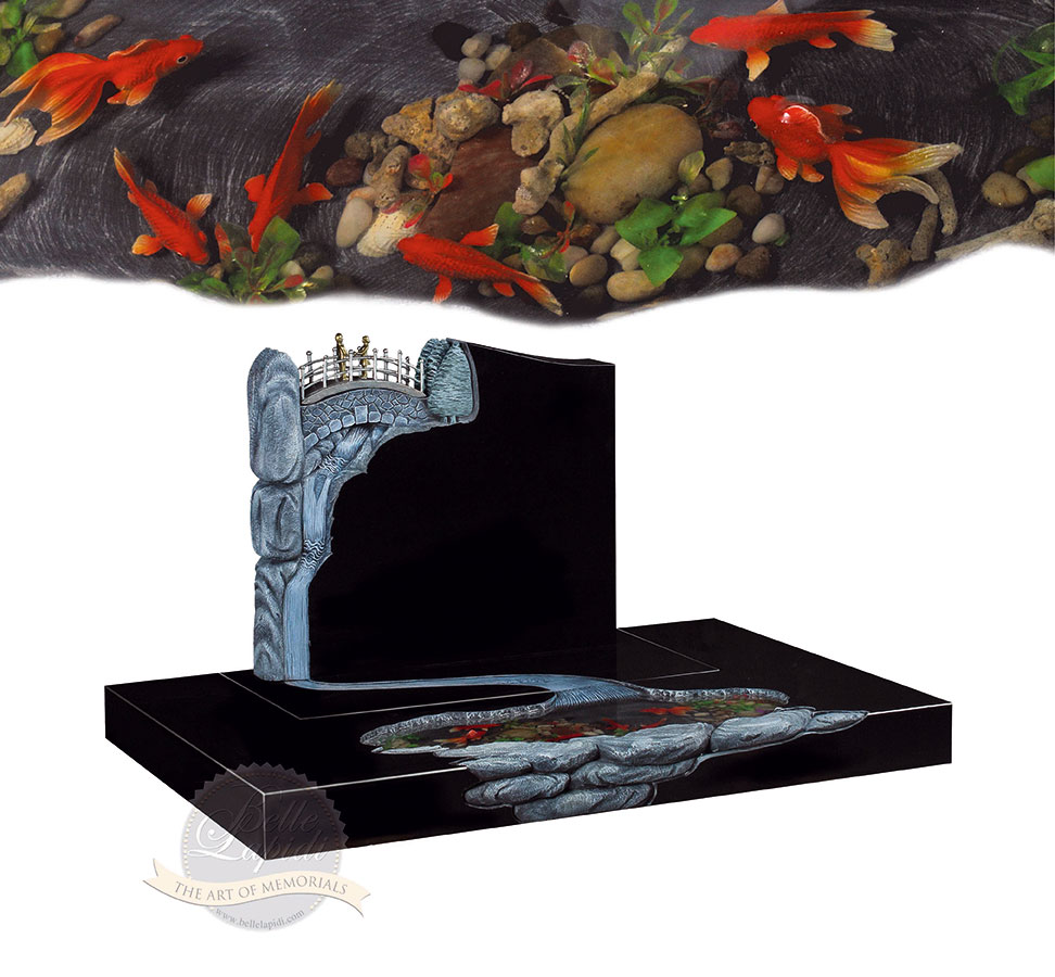 BL206 Jet Black Headstone Beautiful bridge with carved waterfall and unique scene set in the surround