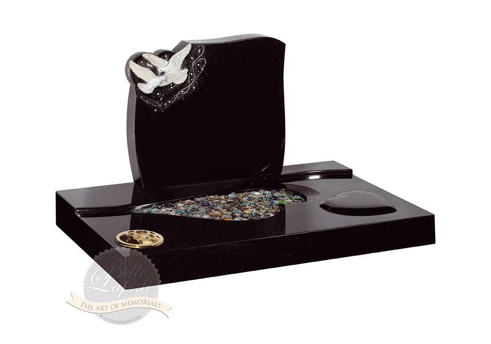 BL208 Jet Black Headstone A pair of doves, sparkle effect and diamantes situated on a small bullnosed heart with raised heart and heart cut-out in surround