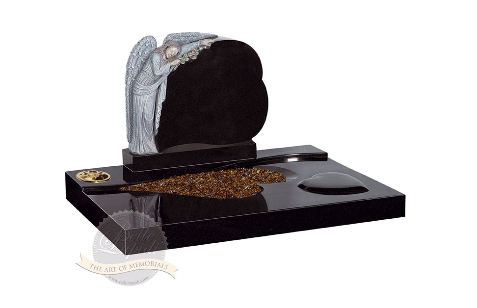 BL209 Jet Black Headstone Beautifully carved angel delicately coloured with heart headstone. Heart cut-out in surround along with a raised heart