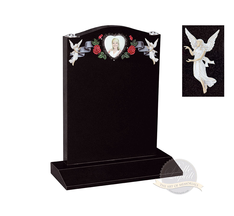 BL28 Jet Black Headstone Sandblasted and engraved scroll design with heart shaped ceramic photo plaque and beautiful angels