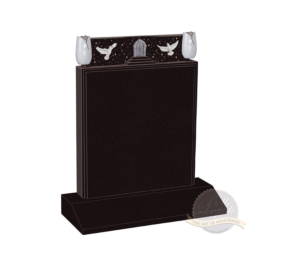 BL50 Jet Black Headstone A pair of ceramic doves placed either side of carved steps and gates of heaven with two stunning flower vases (Available in differnet colours)