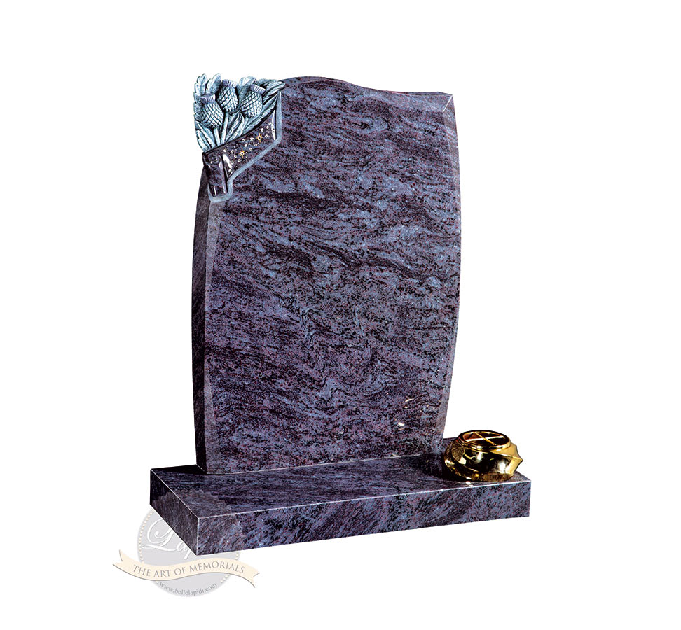 BL77 Silk Blue Headstone Carved thistles with scroll design, diamantes and sparkle effect