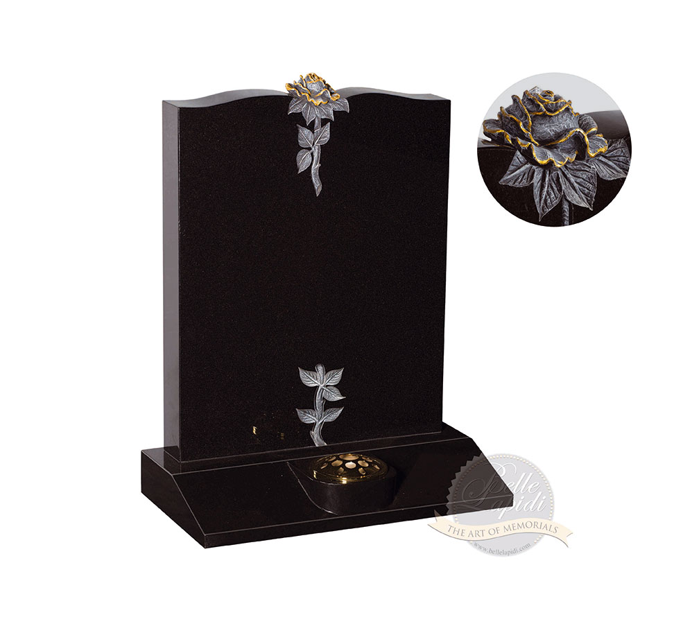 BL84 Jet Black Headstone Simple yet effective design with beautiful rose and leaves to divide memorial