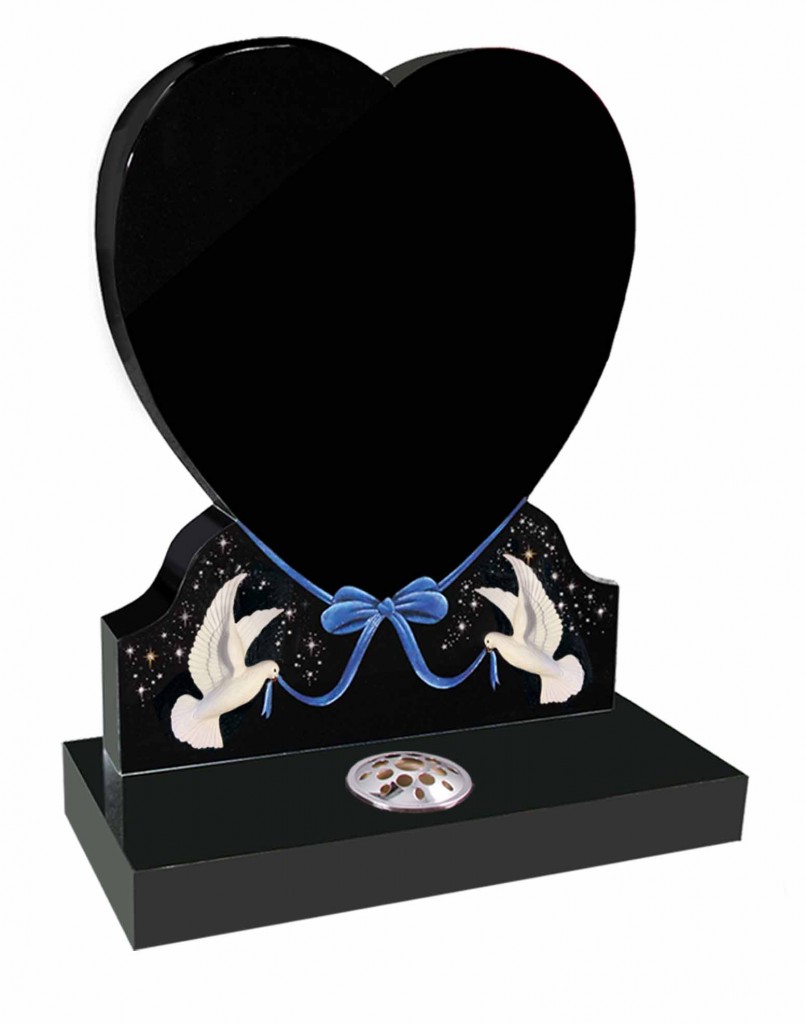 A classic heart with shoulders memorial with a ribbon bow and doves with sparkle design.