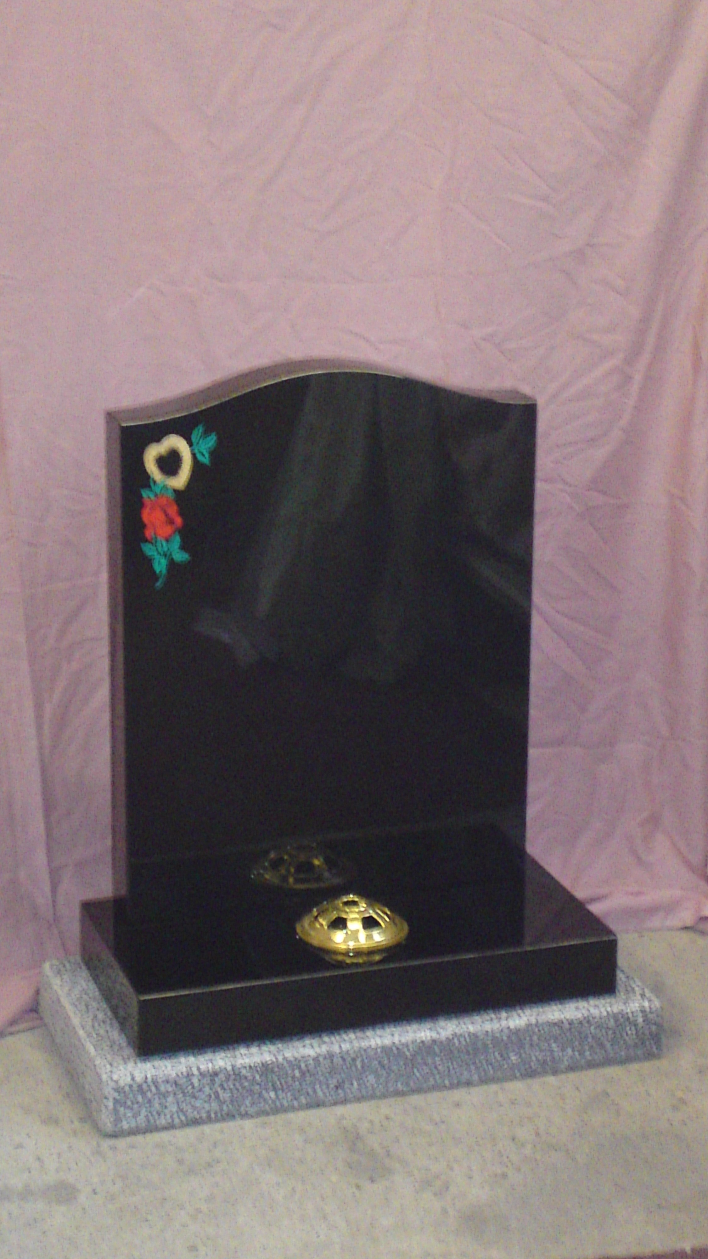 A classic black granite ogee top headstone with one flower vase and a small design all lettering included.